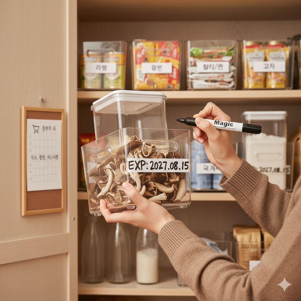 유통기한 크게 적기: 글씨가 작아 안 보인다면, 매직으로 상단에 유통기한을 크게 써두는 것도 아주 좋은 방법입니다.